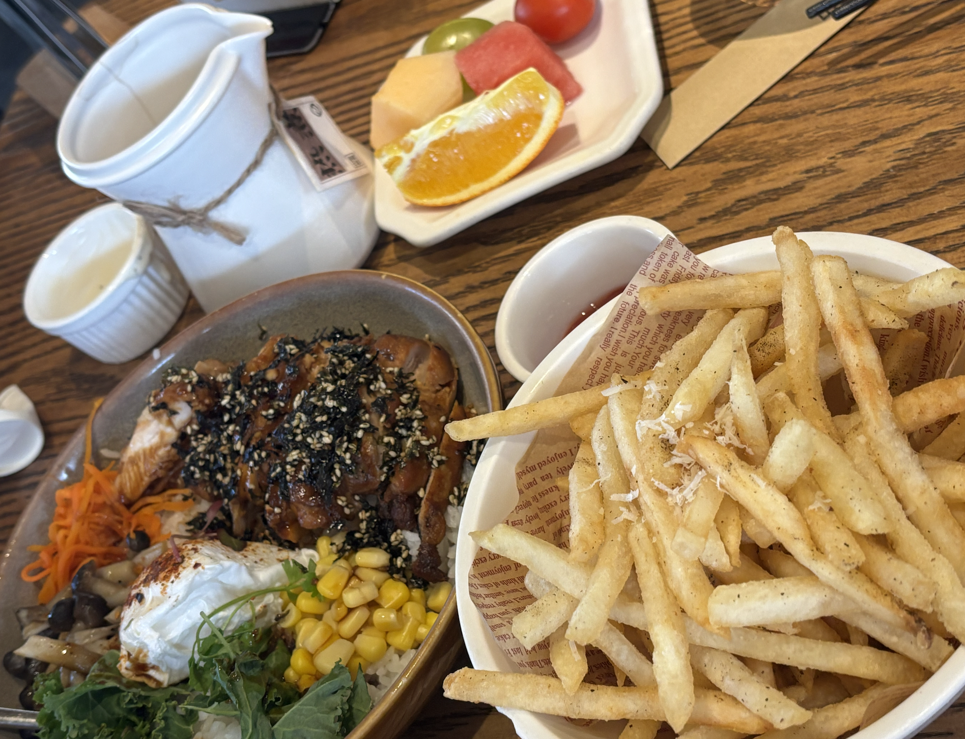 테리야키 스타일로 구운 닭고기와 신선한 채소, 수란 혹은 크림이 올라간 덮밥. 건강한 한 끼를 즐기기 딱 좋아요. - 세트로 먹으면 신선한 오렌지 쥬스와 함께 즐길 수 있어요
