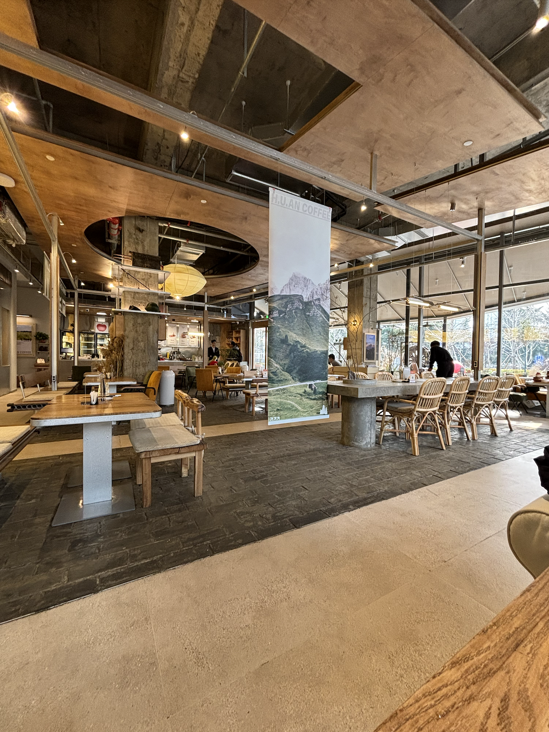 창밖으로 보이는 작은 정원과 자연스러운 조경 덕분에, 커피를 마시며 창밖 풍경을 바라보는 것만으로도 마음이 편안해집니다. 내부 곳곳에는 웅장한 산 풍경 배너와 브랜드 로고인 산 모양 심볼이 걸려 있어 ‘자연에서 영감을 받은 공간’이라는 느낌을 강하게 줘요.